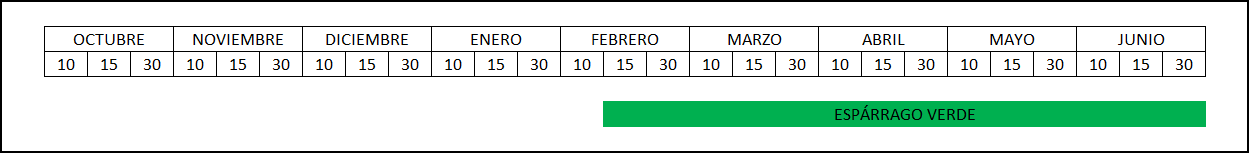 Las fechas en las que comenzamos ha recolectar esparrago varían en función de la climatología de cada campaña, algunos años es posible iniciar la recolección desde mediados de febrero, mientras que otros hay que esperar hasta primeros de marzo. Una vez iniciada la recolección podemos mantener la oferta hasta el mes de junio.