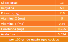 Desde el punto de vista nutritivo el espárrago tiene un escaso aporte calórico, es rico en agua (90% aproximadamente), apenas contiene proteínas (2,9%), pero sí mucha cantidad de fibra, lo que lo convierte en el perfecto aliado de las dietas de adelgazamiento. Asimismo, es rico en vitaminas: C, A, tiamina (B1), riboflavina (B2) y en minerales como potasio y calcio. Su peculiar sabor hace que sea muy apreciado en gastronomía donde se emplea de muy diversas formas: como entrante, acompañados de cualquier salsa (mayonesa, vinagreta, bechamel y ligeramente gratinados), como crema, en revuelto con huevos, como ingrediente de ensaladas, en sopas, en mousses, como guarniciones, etc., son todo un lujo para el paladar.